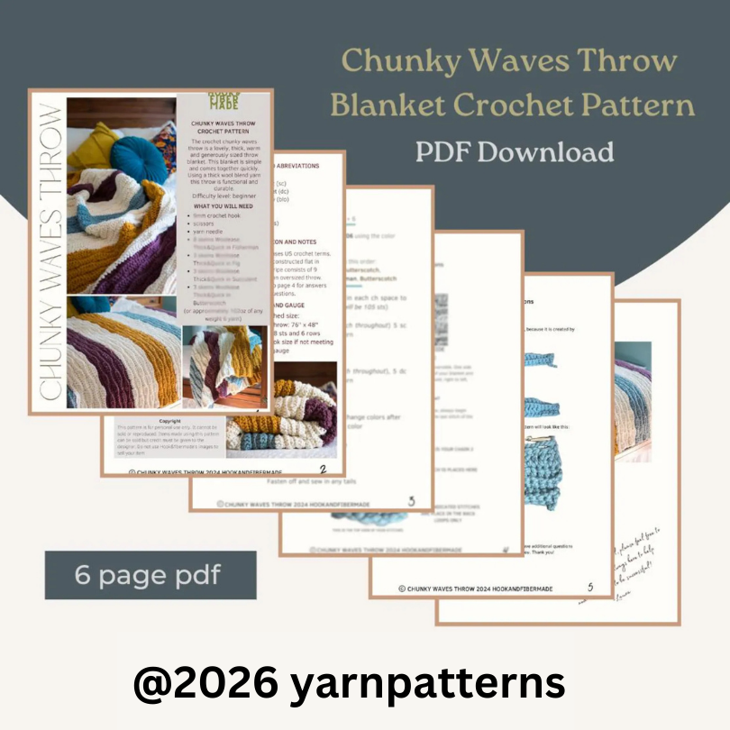 Create a bold, cozy statement blanket with beautiful flowing wave texture and plush chunky softness. This oversized design works up quickly and adds modern warmth to any space. Relaxing to crochet and beginner-friendly.